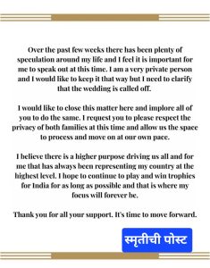 स्मृतीने लिहिले, ‘‘गेल्या काही आठवड्यांपासून माझ्या वैयक्तिक आयुष्यावर होणारी चर्चा मला आणि माझ्या कुटुंबाला असह्य झाली आहे. आता मी फक्त माझ्या क्रिकेटवर लक्ष देणार. कृपया माझ्या खाजगी जीवनाचा आदर करा. मी मैदानात बॅट उचलणार, तुम्ही फक्त चौकार-षटकार गणतील, एवढीच अपेक्षा आहे.’’