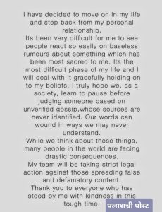 पलाश मुच्छल तर थेट इशारा देऊन गेला. ‘‘हा माझ्या आयुष्यातील सगळ्यात कठीण टप्पा आहे. आम्ही दोघांनी परस्पर संमतीने वेगळे होण्याचा निर्णय घेतला. पण सोशल मीडियावर चाललेले बेसलेस आरोप, स्क्रीनशॉट्स आणि बदनामी आम्ही सहन करणार नाही. यापुढेही असे निराधार मजकूर पसरवणाऱ्यांवर कायदेशीर कारवाई होईल.’’